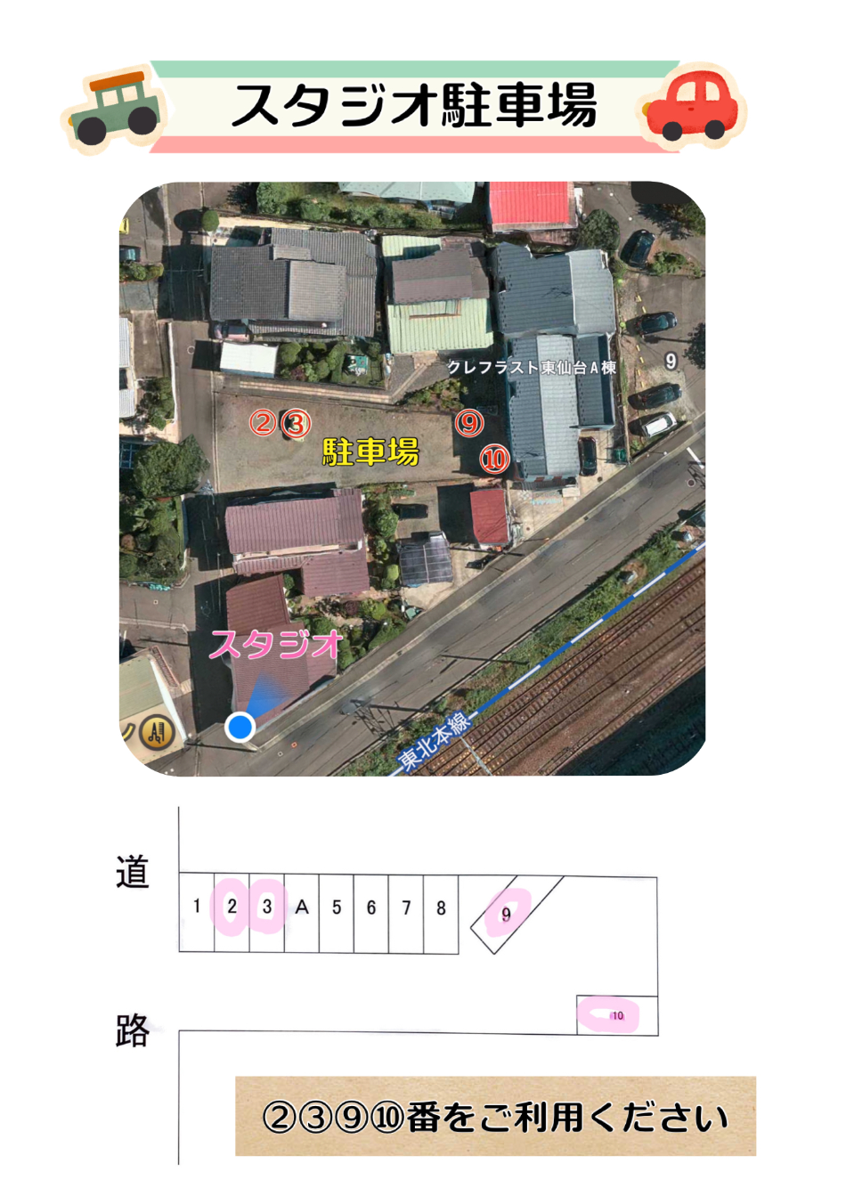 当スタジオは駐車場が4台分ございます。(スタジオ裏 ②③⑨⑩番)