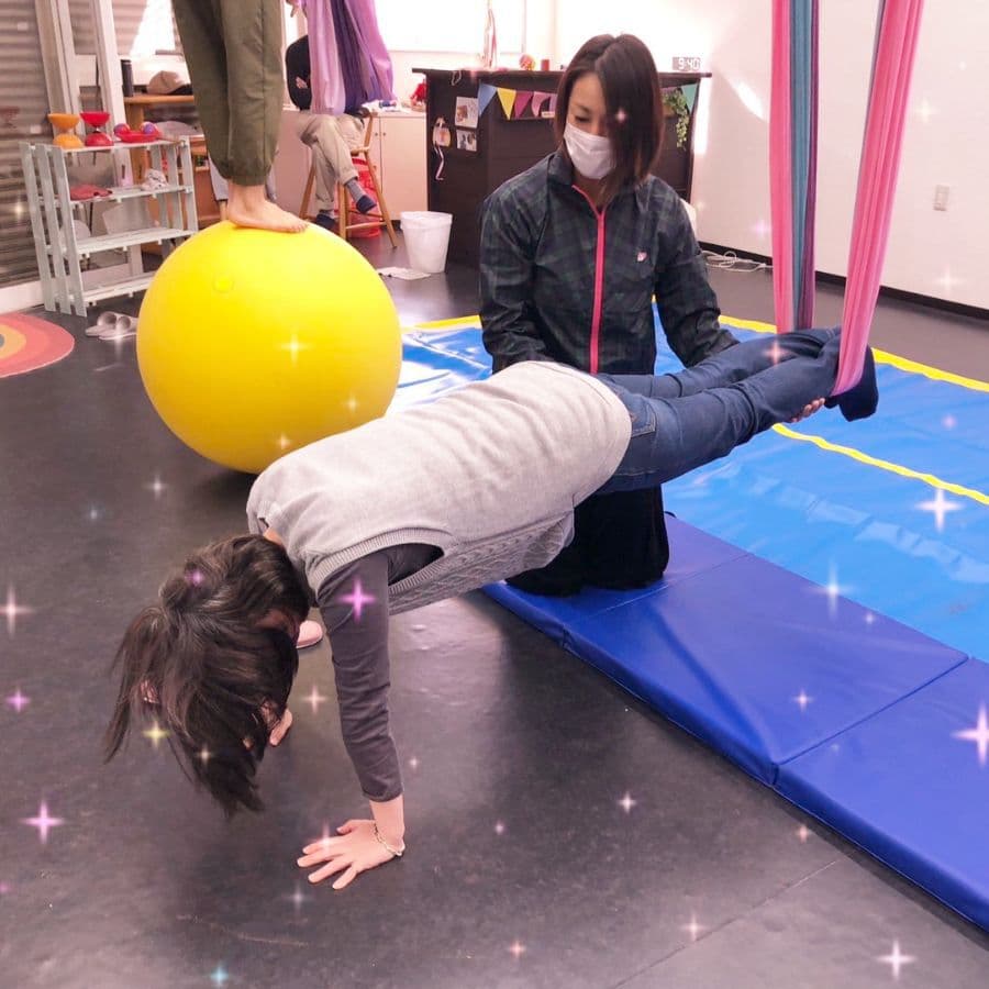 様々な体の動きを、体操器具(マット、跳び箱、鉄棒、なわとび、フープなど)やサーカス用具(一輪車、玉乗り、エアリアル、ジャグリングなど)、を使って遊びながら習得します。 日によって使用する器具やプログラムは変更します。 1800円/1回 6000円/4回券